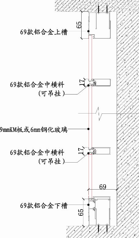 69款單面隔墻相關(guān)數(shù)據(jù)參數(shù)大致如下:69款單面隔墻壁槽用6908側(cè)柱收邊,側(cè)柱厚度為:15mm,上槽為:55mm,下槽為:65mm,橫壓條為:17mm,豎壓條為:13mm。