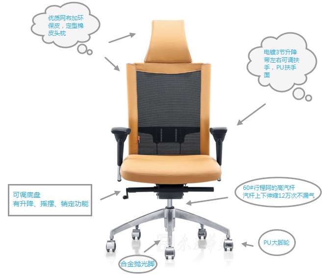 B:合金拋光腳,PU大腳輪,60#行程阿的高汽桿,汽桿上下伸縮12萬次不漏氣。