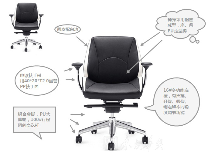 A:椅身采用鋼管成型,座、背PU定型棉,西皮配白邊.鋁合金腳,PU大腳輪,100#行程阿的高汔桿。
