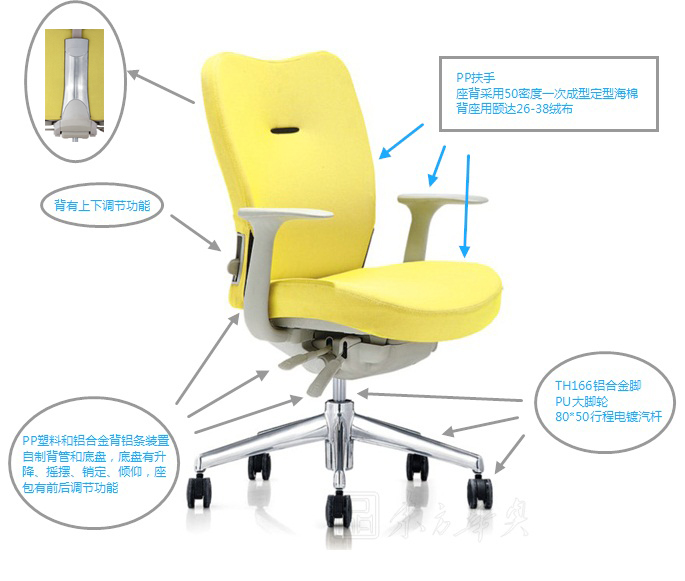 A:用TH166PP扶手,TH166鋁合金腳,PU大腳輪,80*50行程電鍍汽桿。背有上下調
