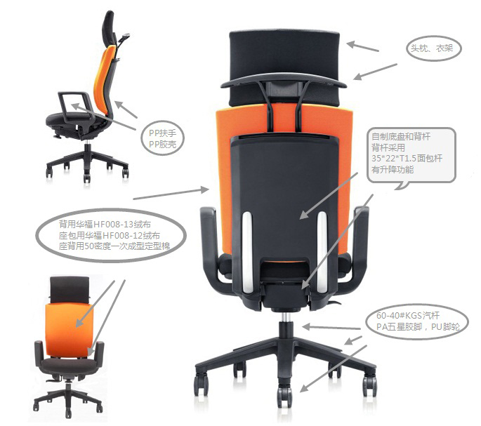 B:座背用50密度一次成型定型棉,帶頭枕、衣架、帶發泡PP扶手,PP膠殼,用60-