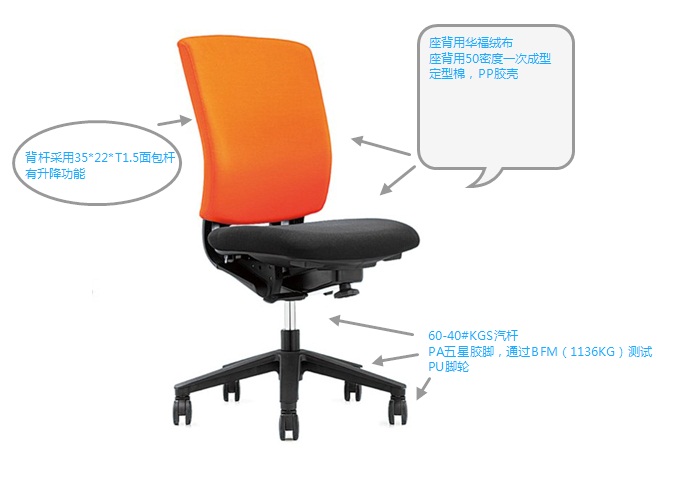 B:座背用50密度一次成型定型棉,PP膠殼,用60-40#KGS汽桿,PA五星膠腳,通過